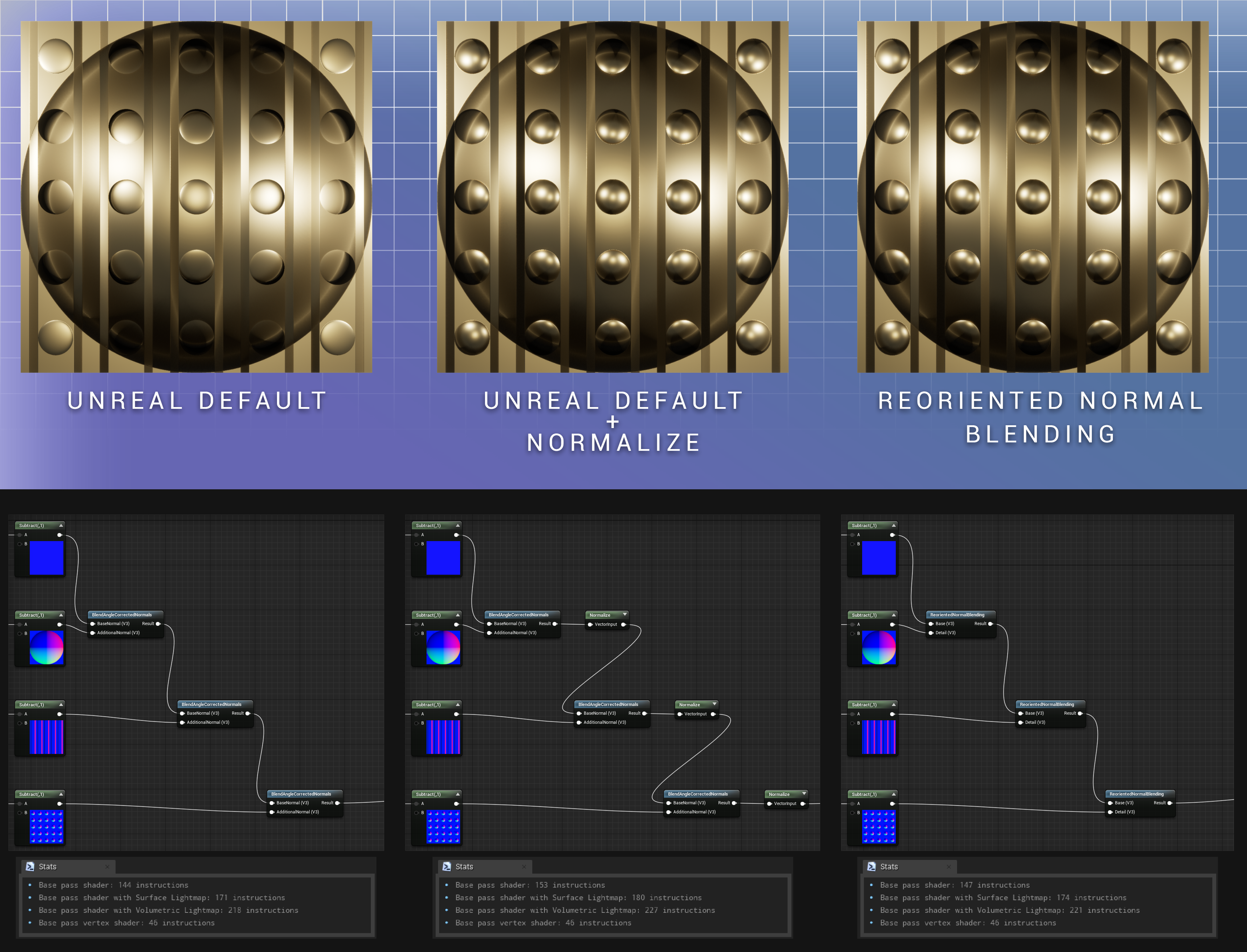 Default : 144 instructions // Default + Normalize : 157 intructions // Reoriented Normal Blend : 147 instructions.